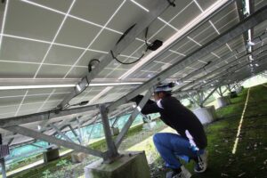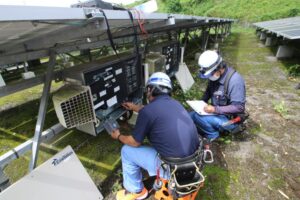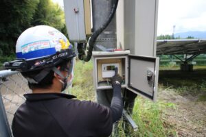 機械に接続し、一列ごとの発電量やフレームに破損はないか、ボルトもひとつひとつ緩んでないか丁寧に確認します。