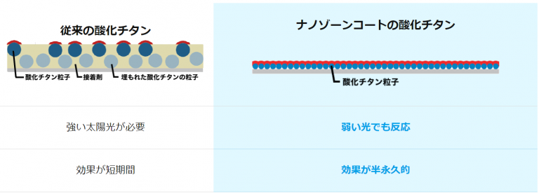 ナノゾーンコートでは酸化チタンを使い、光に反応して消臭、